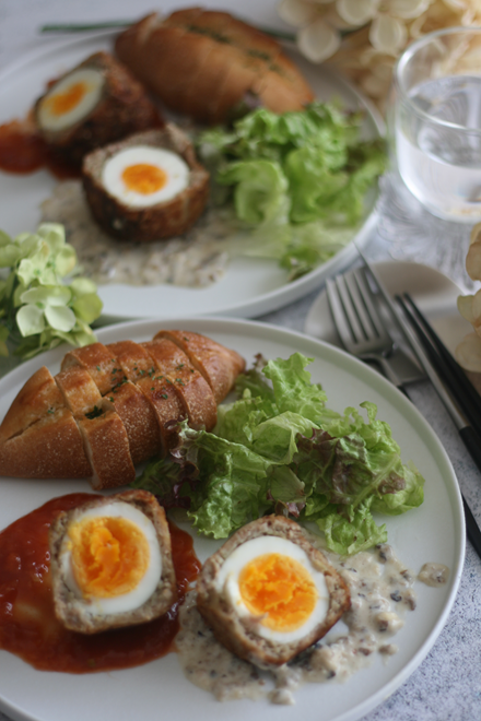 焼き上がりを待ちながらランチタイムをお楽しみいただいていますが5月6月レッスンランチはデモ生地で作るガーリッククッペに2種類のソースで食べるスコッチエッグ