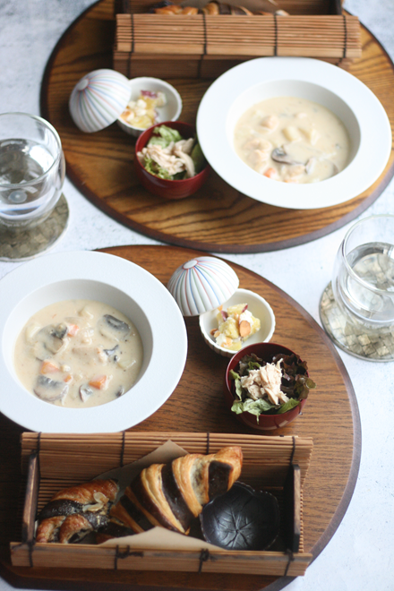 デモ生地で作るバイカラークロワッサンとチキンとマッシュルームのスープやサラダ